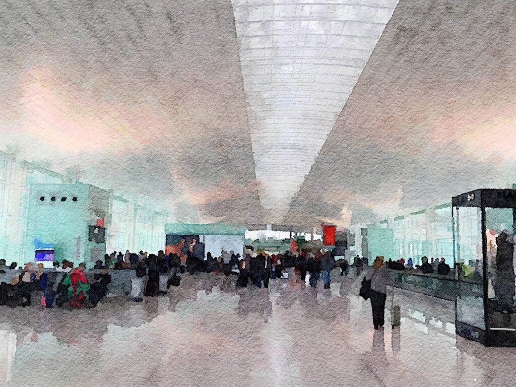 13. November 2015 – Tag 102 Rückflug von Santiago de Compostela über Barcelona nach Basel Auf dem Weg zurück nach Basel erwischt mich eine erste, heftige Kulturschockattacke im Flughafen von Barcelona.