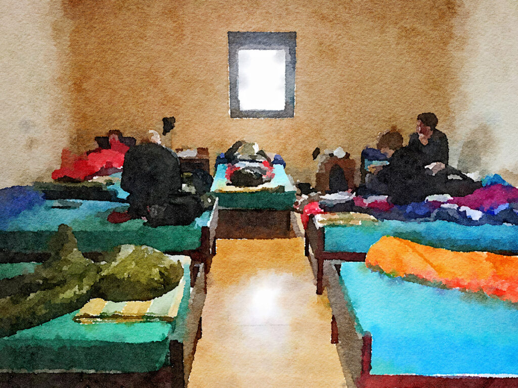 In Puente Villarente habe ich in der schönen, privaten Herberge ‚San Pelayo’ in einem der besseren Zimmer mit 9 Einzelbetten übernachtet (siehe das heutige Foto). In den ‚normalen’ Zimmer stehen gleichviele Doppelstockbetten. Leider gibt es auch in den besseren Zimmern keinen Platz, um z.B. feuchte Socken oder ein feuchtes Handtuch aufzuhängen.