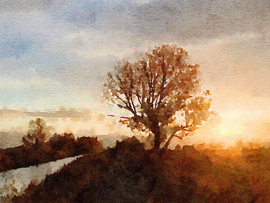Beim Aufbruch zu meinem dritten Wandertag auf dem iberischen Hochplateau färbten sich die Wolken rosa und sahen schon viel weniger bedrohlich aus. Zum Sonnenaufgang lief ich gerade an einem baum- und schilfbestandenen Kanal entlang und die ersten Sonnenstrahlen tauchten die Welt um mich herum in Gold. Das heutige Bild ist dort entstanden.