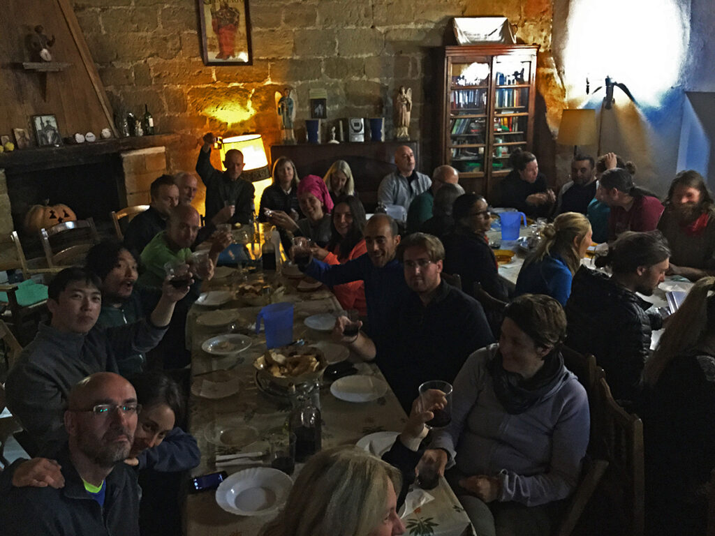 Heute übernachte ich in der kirchlichen Herberge von Grañón. Die Herberge befindet sich in den Hohlräumen unter dem Dach der Dorfkirche. Hier bereiten Pilger und Hospitaleros gemeinsam das Abendessen zu und es wird gemeinsam gebetet, gegessen und gefeiert. Man schläft auf ca. 50 einfachen Sportmatten auf dem Boden und es gibt nur sehr wenige Toiletten und Duschen.