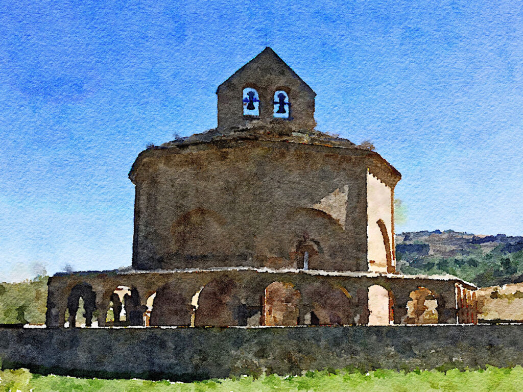 Sie liegt einsam mitten in Feldern, wo die Jakobswege von Somport (Aragonien) und von Roncesvalles (französischer Weg) zusammentreffen. Ein eigenartiger Zauber geht von dem Bauwerk mit achteckigem Grundriss aus.