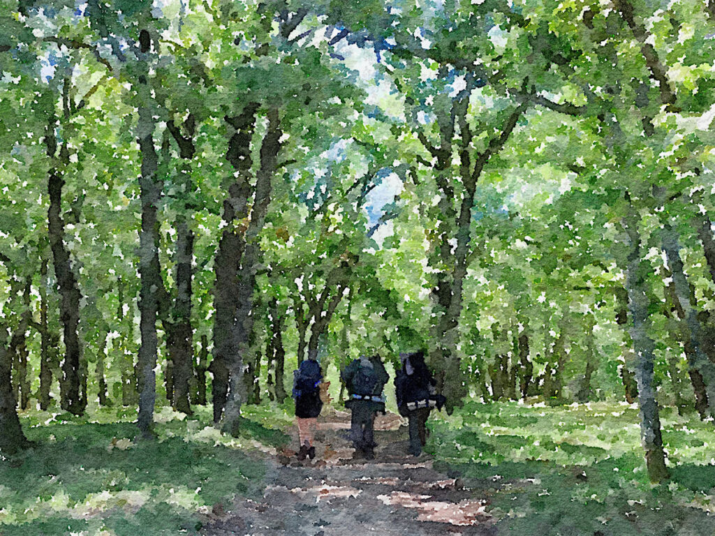 Der Weg führte vormittags oft durch Wald, der im Gegenlicht der Sonne wunderschön leuchtete. Mein heutiges Bild entstand, als gerade drei Pilgerinnen vor mir liefen.
