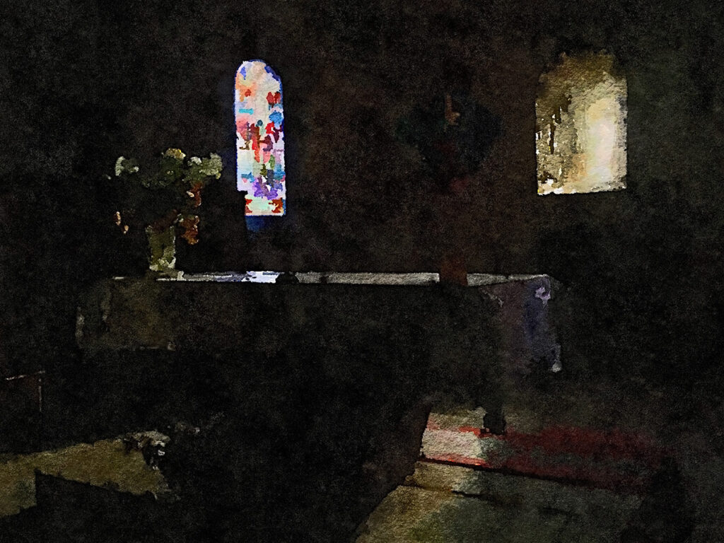 Unterwegs gibt es immer wieder magische Momente – meist kurz – die man leicht verpasst, wenn man das Hier & Jetzt im Tagtraum verlassen hat. Heute waren es ein paar kaputte Wanderschuhe am Randes des Jakobswegs. Sie standen dort wie von einem Künstler komponiert. Einen anderen erlebte ich in der kleinen Kirche von La Chaze-de-Peyre, wo Licht und Farben im Altarraum wie von einer anderen Welt waren. Ich habe versucht, das im heutigen Bild einzufangen.