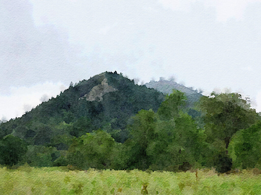 Gail, Thieri und ich sind zusammen zum 1’300 m hohen Pass aufgestiegen. Wir sind nahezu trocken geblieben, obwohl der Himmel weiterhin bedrohlich dunkel aussah. Vom Pass aus blickten wir in eine weite Ebene mit vielen Vulkankegeln, die von oben aussah wie das Land von Tolkin’s Hobbits (siehe heutiges Bild).