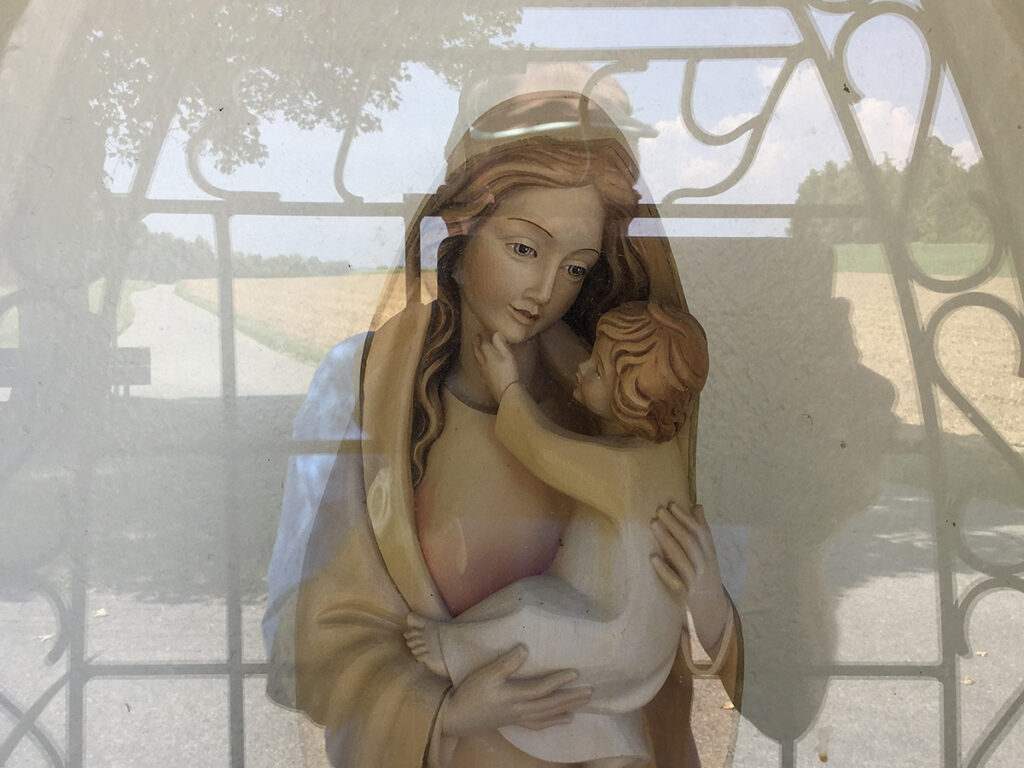 Direkt vor dem schattenspendenden Baum stand in einer Nische hinter Glas eine María mit dem Jesuskind. Die Maria war ausgesprochen hübsch und hatte einen sehr sanften Blick.