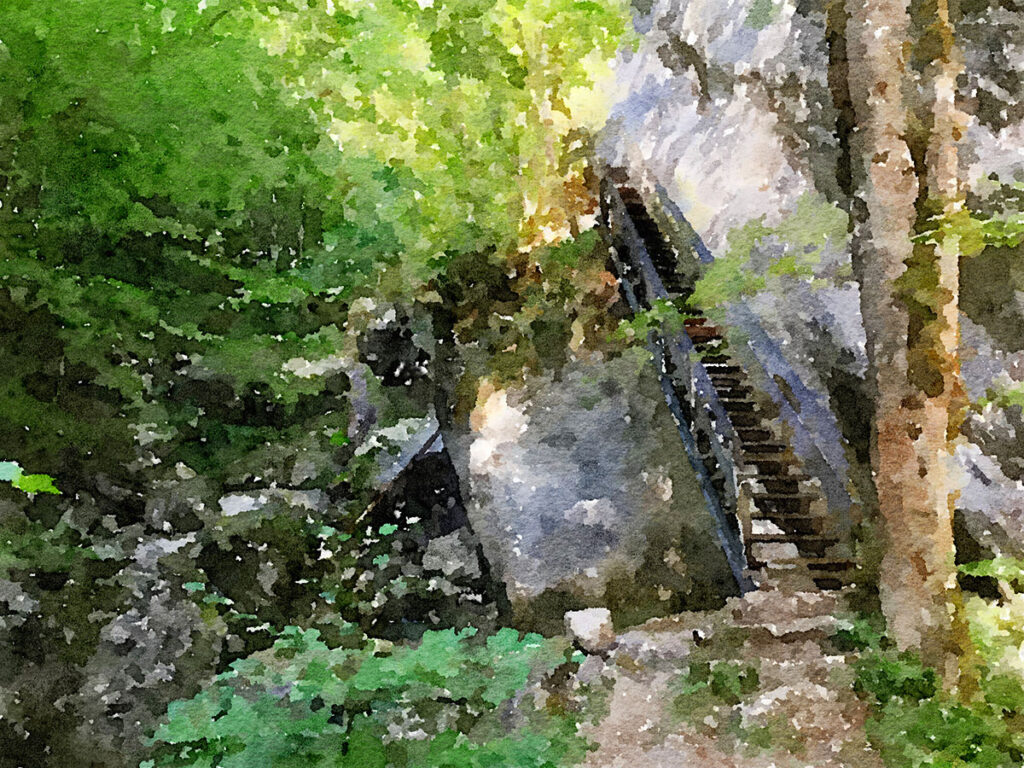 Heute war es wieder sehr sonnig, aber nicht mehr so heiss. Das Laufen fiel mir leichter als gestern und ich bin zügig vorangekommen. Ein touristischer Höhepunkt waren zweifellos die ‘Gorges de Perrefitte’, eine vom Bach ‘La Chalière’ ins Gestein gefressene, wilde Schlucht. An den steilsten Stellen sind Treppen angebracht, um so Wanderern den Durchstieg durch die Schluchten zu ermöglichen.